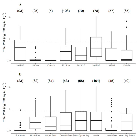 Paralytic shellfish toxins (log scale) in J. edwardsii hepatopancreas across all bloom years (a) and management zones (b) on the east coast of Tasmania from 2012 to 2000. Bloom years are from May until April each year: management zones relate to those given in Figure 1, presented (left to right) from north to south. Boxes indicate median, first and third quartiles; whiskers extend to maximum of 1.5 times the interquartile range; outlying points are plotted individually; number of samples in brackets. Bivalve maximum allowable level shown as black dotted line.