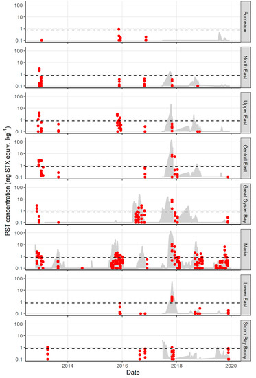 - Campbell, A.; Hudson, D.; McLeod, C.; Nicholls, C.; Pointon, A. Tactical Research fund: Review of the 2012–13 Paralytic Shellfish Toxin Event in Tasmania Associated with the Dinoflagellate Alga, Alexandrium tamarense; FRDC Report 2012/060; South Australian Research and Development Institute: Adelaide, Australia, 2013.