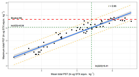 To determine if the regulatory sampling regime adequately represented PST levels across the lobster population of a site with respect to the bivalve ML, data from the start and end of the blooms (defined as periods when all samples from a site were <1 mg STX equiv. kg−1) were examined. This subset of data was chosen because bloom initiation and termination when toxin levels are below the bivalve ML is the period of most concern to the risk management program and the consistency of variability across the entire bloom was unknown. The PST concentrations in the hepatopancreas in both data sets were normal and homogeneous when transformed using a log function. The total PST levels from the two data sets were not significantly different (p value 0.47); therefore, the data were combined for analysis. The mean and the maximum PST concentration from each sampling event were linearly related (Figure 4; r = 0.95). Interpolation of the upper 95% prediction interval intersection with the bivalve ML was then used to obtain the estimates for the mean PST of a sample event, below which there was 97.5% or greater probability that the population of that site would comply with the bivalve ML. Figure 4 demonstrates that this level of confidence would be achieved when the mean PST concentration at a site was at or below 0.22 mg STX equiv. kg−1. On average, this occurs when the maximum PST concentration is at or below 0.42 mg STX equiv. kg−1.
