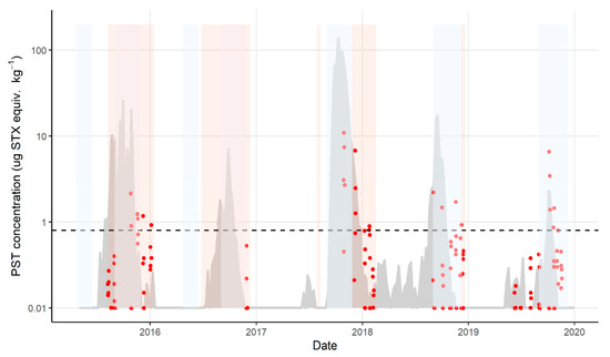 Paralytic shellfish toxins concentrations in J. edwardsii and M. galloprovincialis, Maria zone, from 2015 to 2020: J. edwardsii hepatopancreas (red dots); M. galloprovincialis (grey shaded area, screen and confirmed data); fisheries management closures shaded blue and lobster biotoxin closures shaded orange. Horizontal dotted line represents the bivalve ML.
