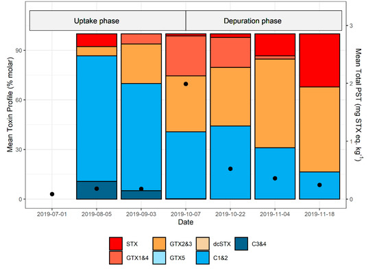 Mean paralytic shellfish toxin profiles (molar percentage) and mean total PST (toxicity equivalents) in J. edwardsii hepatopancreas from Maria Island during the 2019/2020 bloom. Toxin profile data only includes lobster with total PST > 0.1 mg STX equiv. kg−1, whilst total PST data includes all samples taken on that day. Mean total PST shown as black dots.
