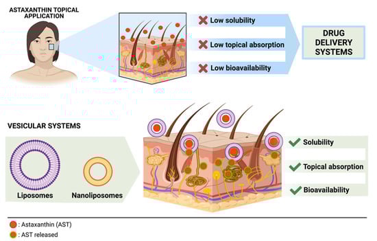 Disadvantages of the topical administration of AST and the use of delivery systems to improve the properties of the molecule, favoring skin absorption. Below: a schematic representation of vesicular systems (liposomes and nanoliposomes) acting as delivery systems for AST. Created with BioRender.com (accessed on 17 August 2021).