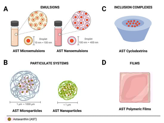 Schematic representation of AST delivery systems. (A) Emulsions: AST microemulsions and nanoemulsions; (B) particulate systems: AST microparticles and nanoparticles; (C) inclusion complexes: AST cyclodextrins (CDs); (D) films: AST polymeric films. Created with BioRender.com (accessed on 17 August 2021).