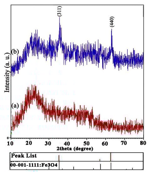 The XRD patterns of prepared pure spongin (a) and spongin–Fe3O4 nanocomposites (b) are shown in Figure 1. Figure 1b clearly indicates that for Fe3O4 nanoparticles, the diffraction peaks appeared at 2Ɵ angles of 30.0, 35.5, 43.1, 53.6, 57.2, and 62.5, corresponding to the (330), (311), (004), (224), (115), and (440) crystal planes, respectively, suggesting a face-centered cubic lattice (fcc) crystal structure (JCPDS card no. 19-0629) [,]. This confirms that the preparation procedure did not have an effect on the crystal structure of the ingredients. The strongest peak at 2Ɵ = ~25.5 was attributed to the hkl index (101) [].