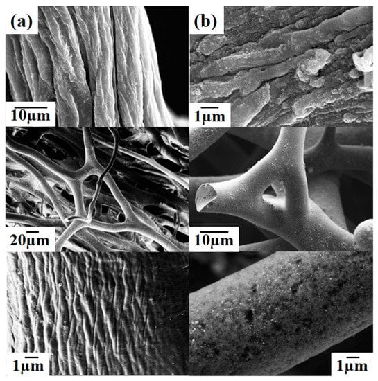 FESEM images of spongin without iron oxide (a) and with iron oxide (b).