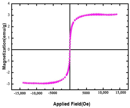 Figure 3 shows the results of the VSM analysis of spongin–Fe3O4. A study of the magnetic spongin–Fe3O4 nanocomposites revealed that nanoparticles have considerable magnetic properties, with a magnetic saturation value of 3.252 emu/g, which is acceptable for practical applications involving the dispersion of the spongin nanocomposites in water and their collection using a magnetic field [].