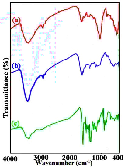 FTIR analyses were performed on (a) spongin, (b) spongin–Fe3O4, and (c) spongin–Fe3O4–MB samples, and the results are displayed in Figure 4a–c, respectively. In the spongin sample, the wideband extending from 3200 to 3300 cm−1 corresponds to the stretching vibrations of the nitrogen–hydrogen bond (of the amide A groups) and O–H groups (Figure 4a) [,,]. Two bands centered at 2923 cm−1 are associated with the respective asymmetric and symmetric vibrations of CH2 and CH3 [,].