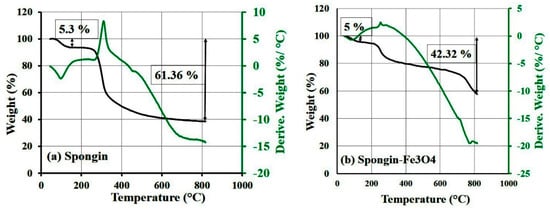 TGA was used to determine the Fe3O4 content of the samples and the thermal stability of the prepared composite. Figure 5a,b present the results of the TGA and DTA curves for the spongin (a) and spongin–Fe3O4 (b) samples, respectively. The observations indicate that spongin is thermally stable below 300 °C, yet above this temperature, a 50% mass loss is observed due to the melting of the α-chains of spongin (this is similar behavior to that of α-keratin) and dissociation of crosslinks formed through −S−S− and hydrogen bonds or salt bridges []. Further increasing the temperature increases the mass loss to 60% due to the decomposition of peptide bonds [].