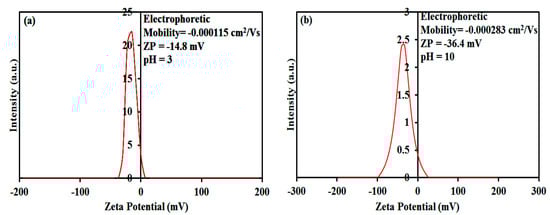 We tested the zeta potential (ZP) of the spongin–Fe3O4 hybrid at pH 3 and 10 (Figure 6a,b, respectively). ZP analysis of the spongin–Fe3O4 nanocomposite revealed a negative charge of −14.8 and −36.4 mV at pH 3 and 10, respectively. In this study, the results indicated that cationic MB and CV dyes were loaded into spongin–Fe3O4 hybrid nanostructures by noncovalent electrostatic interactions. MB and CV are model cationic dyes including –(CH3)2N+ groups, and they firmly exist in solution as positively charged ions within the studied pH range. When pH is between 3 and 10, electrostatic attraction arises between MB or CV (–(CH3)2N+) and the negatively charged (e.g., RS–, RO–, –COO–) functional surface groups –O–H (hydroxyl group), –S–H (thiol group), and -COOH (carboxyl group, amino group (−NH2)) of the spongin–Fe3O4 hybrid [,].