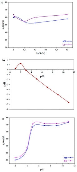 The adsorption capacity of the adsorbents, depending on their nature, can be affected by ionic strength as well as the pH of the dye–wastewater solution. The adsorption of spongin with anionic functional groups (at pH 3–11) is influenced by ion strength via the neutralization of anionic groups by cations. The effect of the ionic strength of the solution containing spongin–Fe3O4, with spongin as the ingredient with the most active ‒RS–, RO–, and –COO– groups, was tested using NaCl solutions at 0.01–0.5 M concentration ranges. As expected, the result revealed a gradual decrease in the MB adsorption capacity and a slight decrease in the CV adsorption capacity of the magnetic biosorbent with an increase in the NaCl concentration up to 0.2 M (Figure 7a). This reduction can be attributed to the competition between Na+ ions and cationic CV and MB in adsorbing onto the negatively charged groups of the bioadsorbents. The mobility of Na+ ions is greater than that of MB or CV, because of the significantly smaller size of the Na+ (1.02 Å) ions in comparison to MB (15.06 Å) and CV (14.52 Å). Therefore, the surface of the adsorbent is more accessible by the sodium cations than by MB and CV. This could also be due to the shielding of surface groups by Na+ ions. Indeed, decreased adsorption capacity due to higher ionic strength caused by the addition of sodium chloride is because of the repulsion between Na+ and cationic MB and CV dyes. When the NaCl concentration increases by more than 0.2 M, a slight increase in dye adsorption on the adsorbents is observed. This behavior is caused by the decrease in the solubility of the dyes’ molecules. This reduction due to the increase in the ionic strength of the media can be attributed to the aggregation of dye molecules through physical interaction, including van der Waals forces, ion–dipole forces, and dipole–dipole forces. The adsorption of aggregated dye molecules on adsorbents results in an increase in the dye adsorption capacity of the adsorbent. Yahya et al. reported a similar trend, in that the adsorption of reactive dyes on activated carbon increased alongside the ionic strength of the media [].