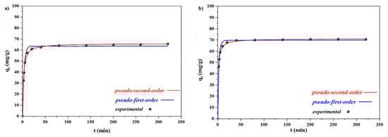 Pseudo-first-order (Equation (1)) and pseudo-second-order (Equation (2)) kinetic models were tested to determine the rate constant and adsorption capacity of the adsorbent nanocomposites ([]):