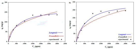 The adsorption isotherms presented in Figure 8 are key to designing adsorption systems. One can easily understand that the adsorption capacity values initially grow before reaching a plateau because the concentration is high, the adsorption sites are saturated, and the adsorption stays constant. The Langmuir and Freundlich isotherms were applied using the empirical equilibrium adsorption data.