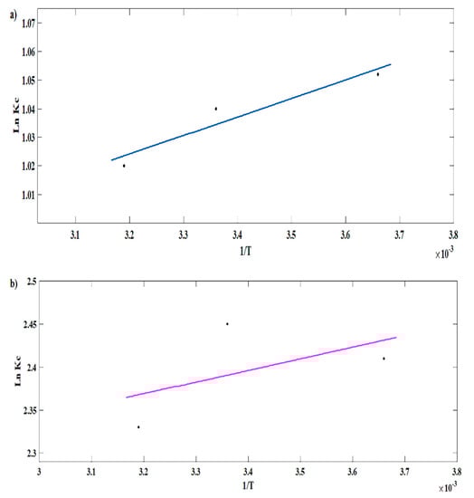 In these equations, Cs and Ce, are the concentrations of each dye in the adsorbent and solution phases, respectively, while Kc is the equilibrium constant, R is the universal gas constant (8.314 J mol K−1), and T is the absolute temperature in Kelvin (K).