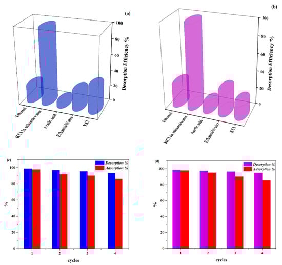 Adsorption capacity is a key factor in choosing the proper adsorbents, yet recyclability is also very important from an economic perspective. In order to determine this factor, desorption experiments were performed using ethanol, ethanol/water (50:50, V:V), acetic acid 0.2 M, KCl 0.05 M, and KCl 0.5 M in water/ethanol (V:V, 50:50) solutions, the results of which can be seen in Figure 11a–d. Based on our observations, a solution of KCl in water/ethanol led to the best regeneration of the used adsorbent for both MB and CV (96% and 98%, respectively). These data are consistent with the effect of ionic strength described above. The experiment reveled good desorption behavior for dyes in both KCl and ethanol solutions, but enhancing ethanol solution to KCl solution increased the desorption of the dyes, which is remarkable. Tests using acetic did not show the expected results (only around 2% for both dyes), but this could be explained by the pH dependence of the adsorbent capacity described above.