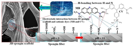 As can be seen in Figure 7c, the adsorption of MB and CV revealed a strong sensitivity to pH. Both MB and CV have ammonium groups that are protonated in an extensive pH range. Furthermore, the pH-dependent behavior of spongin is due to the RS-, RO-, and -COO- groups, which become anionic at pH > 3. Figure 7c shows a sharp increase in the adsorption of dyes between pH 3 and 5.5, but further increase in pH has little effect on adsorption. Thus, the dye’s adsorption performance over a wide pH range (pH 5.5–11) is almost identical, and is at the maximum level. Therefore, there is no need to adjust the pH, which is a very good advantage in removing cationic dyes (i.e., CV and MB) from natural waters. This phenomenon can be explained by the increase in the number of anionic groups on the adsorbent, in which the carboxylate groups become negatively charged at a pH of greater than 4.5; thus, the adsorption of cationic dyes increases. Therefore, at pH values between 4.5 and 11.0, the negatively charged spongin scaffold attracts the cationic CV/MB, and the maximum adsorption capacity was observed in this range (see Scheme 1) []. On the other hand, the absorption is reversed at pH values below 3, because there is some electrostatic repulsion between the spongin scaffold and cationic dyes.