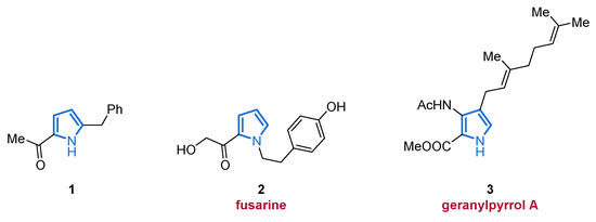 The pyrrole derivative 1-(4-benzyl-1H-pyrrol-3-yl)ethanone (1) was found in a co-culture of the marine-derived fungi Aspergillus sclerotiorum and Penicillium citrinum in 2017 (Figure 1). The acylated pyrrole 1 shows only medium toxicity against brine shrimp (LC50 values of 46.2 µM) and oppositely increases the growth of Staphylococcus aureus at 100 µg/mL [40].