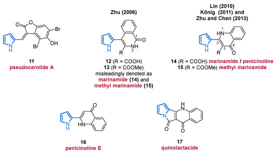 The unusual pyrrolyl 1-isoquinolone alkaloids 12 and 13 were discovered from a habitat in the South China Sea within a co-culture of two mangrove endophytic fungi (strain No. 1924 and 3893) in 2006 [46]. It took until 2011, when König and co-workers isolated methyl marinamide (15) from the marine sponge (Ircinia variabilis) and reported a revised structure of 15, in which the previously assumed 1-isoquinolone of 13 was reassigned as a 4-quinolinone unit on the basis of X-ray crystallography. Unfortunately, 15 showed only weak or no effects in the biological evaluation on cannabinoid receptors [47]. In accordance with the findings of König, Zhu and Chen, chemically modified the previously isolated compound 14 in 2013, which also led to the revision of the structure 12 to 14 for marinamide in the same fashion, further confirming the revision of marinamide by König and co-workers [48]. However, one year before the report of König, the Lin laboratory isolated the same compound 14, but referred to it as penicinoline (Figure 2) [49]. Both compounds 14 and 15 display promising in vitro cytotoxicity towards 95-D and HepG2 cell lines (IC50 values of 0.57 μg/mL and 6.5 μg/mL, respectively) as well as insecticidal activity against Aphis gossypii (100% mortality at 1000 ppm) [48,49].