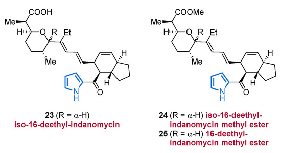 Another pharmacologically interesting compound class is the indanomycins, which possess a variety of biological activities such as antibacterial [53], insecticidal [54], and antiprotozoal [55] properties. In 2011, the group of Kelly and co-workers published a study on the biosynthesis of indanomyincs, including an intramolecular Diels–Alder cyclization of a tetraene as the key step [56]. Two years later, researchers isolated three new representatives of these pyrrole ethers from the culture broth of a marine Streptomyces anibioticus strain PTZ0016 which possess in vitro activity against Staphylococccus aureus (MIC values between 4.0 and 8.0 µg/mL). Based on their previous derivatives and on the α- or β-orientation of the pyran ring, they were named 16-deethylindanomycins. The relative and absolute configurations of iso-16-deethylindanomycin (23), iso-16-deethylindanomycin methyl ester (24), and 16-deethylindanomycin methyl ester (25) were established by extensive NMR and CD spectroscopy (Figure 3) [57].