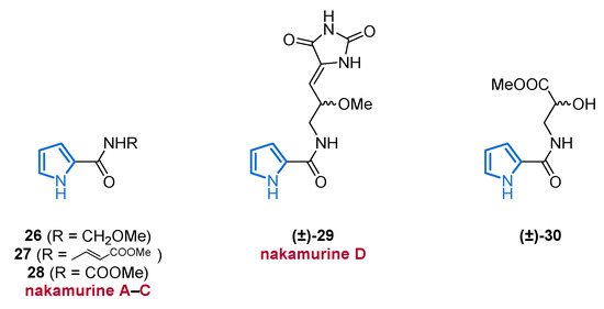 Isolation of five pyrrole-2-carboxamides (26–30) from the sea sponge Agelas nakamurai.