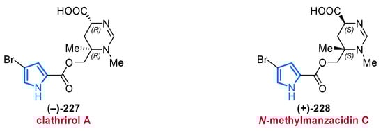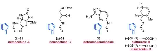 In 2017, Li and co-workers were able to isolate a new class of racemic pyrroles, the nemoechines A–C (31, 32, and 124), from the species Agelas aff. nemoechinata (Figure 5) [69]. Nemoechine A (31) differs from the two related congeners 32 and 124 by its unusual bicyclic cyclopentane-fused imidazole skeleton, whereas nemoechine B (124) features a fused pyrrole core and is therefore specified in Section 2.4. Nemoechine C (32), with its butyric acid ester side chain, shows structural similarity to pyrrole 30 and differs only by an additional methylene group. Unfortunately, nemoechine A (31) and C (32) did not show any promising activities which complies with the inactivity of the structurally related pyrroles 29 and 30 [69].