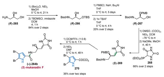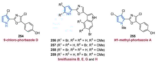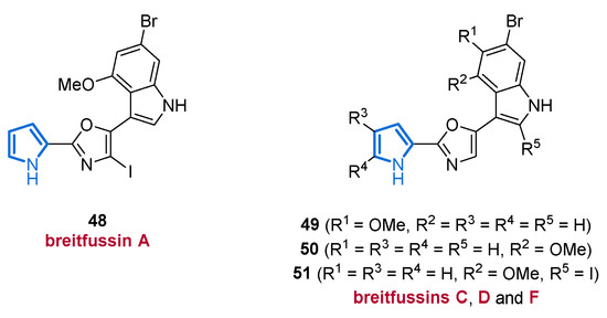 The Arctic hydrozoan Thuiaria breitfussi (family Sertulariidae) produces a class of indole-oxazole-pyrrole MNPs named breitfussins. Biosynthetically, the breitfussins may share a similar biogenesis as the phorbazoles (cf. Figure 33), arising from the dipeptides Pro-Trp or Pro-Tyr. In the first isolation and analysis of breitfussin A (48) in 2012, high-resolution mass spectrometry indicated a ratio of non-hydrogen atoms to hydrogen of 2:1 which makes the structural elucidation by spectroscopic methods challenging [80]. The authors, however, could identify a brominated 4-methoxyindole moiety, a 2-substituted pyrrole core as well as an unresolved C3NO fragment suggestive of an oxazole core, which finally prevented the unambiguous determination of the entire structure. By applying a combined approach of atomic force microscopy (AFM), computer-aided structure elucidation (CASE) and calculation of 13C-NMR shifts through density functional theory (DFT), the structure of breitfussin A (48) could be unequivocally determined (Figure 7) [80]. A recently published article describes the isolation of further non-halogenated congeners, namely breitfussins C (49), D (50), and F (51), of which structures 49 and 50 could also be confirmed by total syntheses (Figure 7) [81].