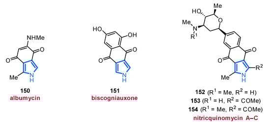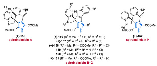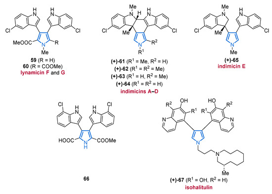 Very recently, the Streptomyces sp. SCSIO 11791 revealed another bisindolylpyrrole (66), displaying moderate cytotoxicity against a human breast cancer cell line (MDA-MB-435, IC50 value of 19.4 µM), while no antibacterial properties could be observed (Figure 8) [87].