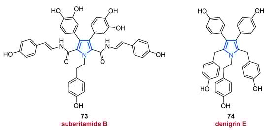 Highly substituted 3,4-diarrylpyrroles suberitamide B (73) and denigrin E (74).