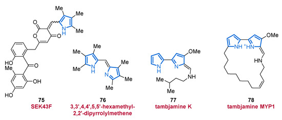 Representation of an APK (75) and three pyrroles 76–78 including the important class of tambjamines.