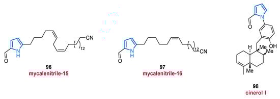 In the course of an investigation of the South China Sea sponge Mycale lissochela in 2017, two new formylpyrroles 96 and 97 bearing an aliphatic side chain with a terminal nitrile group were isolated (Figure 12) [110]. Both mycalenitrile-15 (96) and mycalenitrile-16 (97) showed excellent and good inhibition effects against PTP1B (protein-tyrosine phosphatase 1B, a recognized target for diabetes and obesity) with IC50 values of 8.6 µmol/L and 3.1 µmol/L, respectively, resulting from the unsaturated side chain [110].
