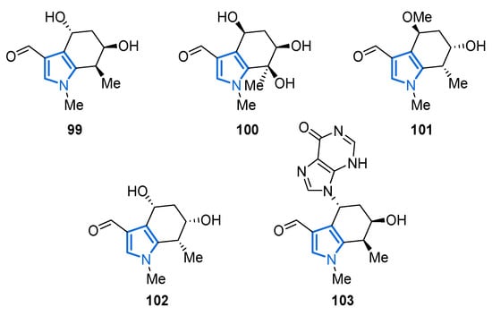 Five new formylpyrroles 99–103 were isolated from the marine cyanobacterium Moorea producens in 2017 (Figure 13) [112]. Biosynthetically, they are suggested to originate from the amino acid tryptophan, the indole moiety of which is partly reduced to forge the annellated tetramethylenepyrrole framework. Further annellated pyrroles are depicted in Section 2.4. All pyrroles described herein feature a 3-formyl group, and compound 103 additionally carries a purine unit. The five isolated pyrroles 99–103 showed no noteworthy cytotoxicity or antibacterial properties [112].