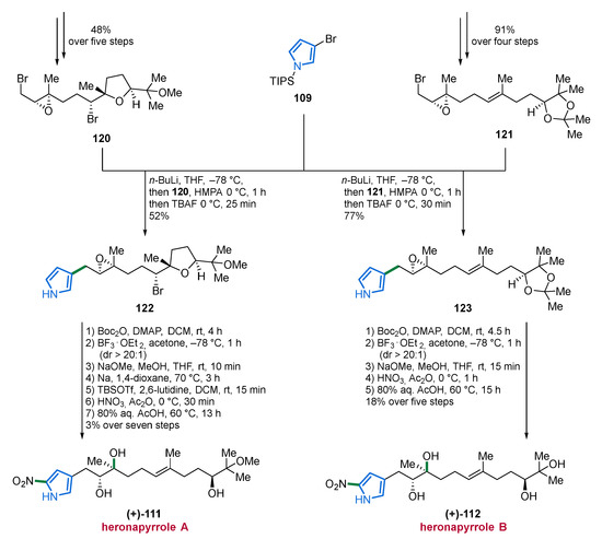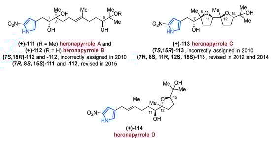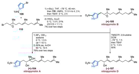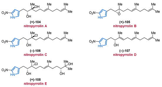 The first MNP from this subclass was isolated back in 2006, however, the structural characterization appears to be incomplete and no information about the stereochemistry was given [113]. In 2010, the group of Fenical reported the isolation of five farnesyl-2-nitropyrroles 104–108 from the marine actinomycete strain CNQ-509 and referred to them as nitropyrrolins A–E (104–108) (Figure 14) [114]. The authors performed several chemical modifications, including an acetonide formation from epoxide 105, and the Mosher method was applied to unequivocally identify the full stereochemistry of nitropyrrolins A–E (104–108). Among compounds 104–108, nitropyrrolin D (107) displayed the most promising IC50 value of 5.7 µM in biological assays against HCT-116 colon carcinoma cells, whereas a lower antibacterial activity against MRSA was observed for all nitropyrrolins 104–108 (MIC values >20 µg/mL). Some of the synthetic derivatives synthesized in the course of the structure elucidation process showed strong to moderate cytotoxic (IC50 values between 9.2 µM and 24.4 µM) and promising antibacterial properties (MIC value of 2.8 µg/mL) [114].