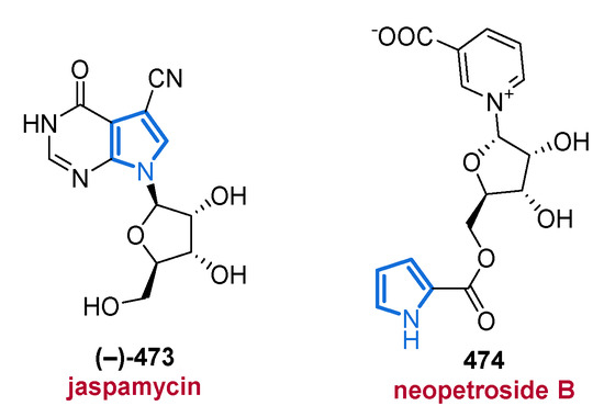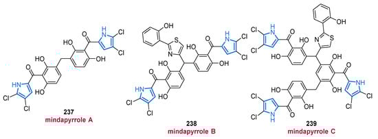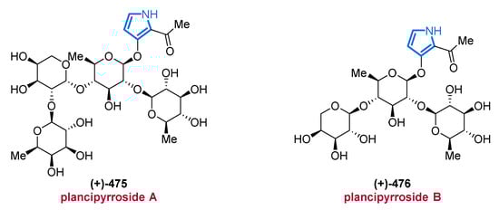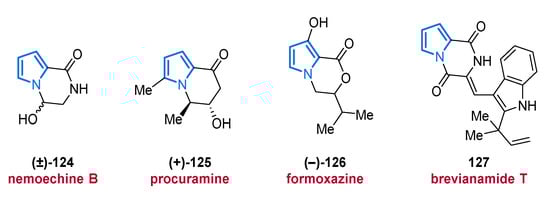 The five-membered planar 6π heteroaromatic pyrrole core with its high electron density is a reactive and privileged structural motif found in many biomolecules. It can provide stacking interactions, coordinate metal ions, or form hydrogen bonds when devoid of a substituent in the 1-position. Probably, the most well-known pyrrole derivatives in nature possess a tetrapyrrole skeleton, which can, e.g., be found in heme, chlorophyll, and several other porphyrinoid cofactors [29,30]. However, pyrroles possessing much simpler architectures have also attracted considerable interest, e.g., as promising lead structures in medicinal chemistry [15]. The biggest-selling drug of all time, the blood cholesterol lowering HMG-CoA reductase inhibitor atorvastatin (Lipitor®), is a pyrrole derivative. Not surprisingly, many pyrrole MNPs have also been associated with various pharmacological activities, such as cytotoxic [31,32], anti-bacterial [33,34], anti-fungal [35], and anti-cancer properties [6,36,37].