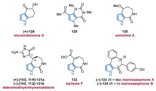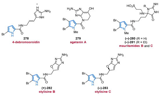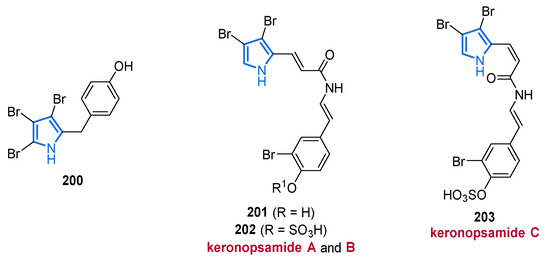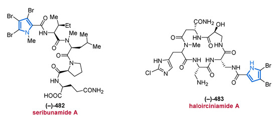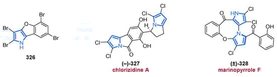 In addition to the reported structures and their biological sources, known biological activities and, where applicable, the first total syntheses of these compounds will be shown. Furthermore, this review is subdivided by structural subclasses based on the substitution pattern of the pyrrole core. As a delineation, only MNPs with intact pyrrole functionality are described, whereas indole alkaloids [20], the saturated heterocycles pyrroline and pyrrolidine [21], as well as other fused systems (e.g., carbazoles) and pyrrole derivatives lacking a genuine pyrrole core [22,23,24,25], will not be covered. Several other specific overviews focusing on subclasses such as bromopyrroles [26,27] and pyrrole-imidazole alkaloids (PIA) [13,14,28] or with the focus on the isolation source [14,25,27], have been published. In contrast, we intend to provide the reader with an impression of the multiple facets of pyrrole alkaloids in the marine environment.
