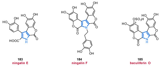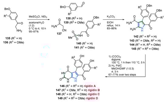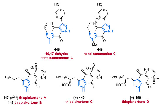In 2020, denigrin E (74) was isolated from a new Dactylia sp. along with several members of the pyrrolone family. Unfortunately, no inhibitory activity against PAX3-FOXO1 luciferase expression was observed in biological assays (Figure 9) [90]. By considering the substitution pattern of these 3,4-diarylpyrroles 73 and 74, a close relationship as potential precursors of lamellarins (see Section 2.4.1) in a biosynthetic context can be suggested.