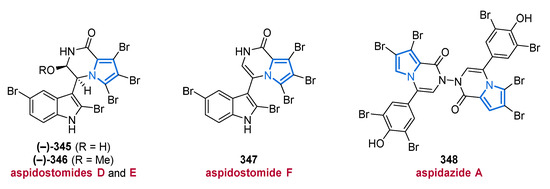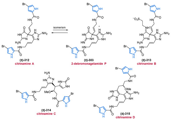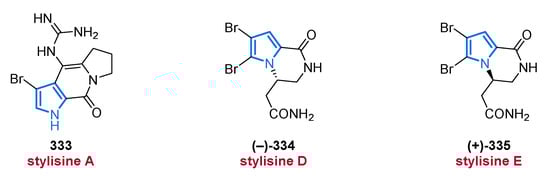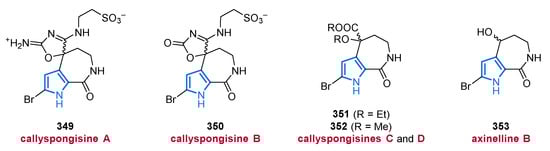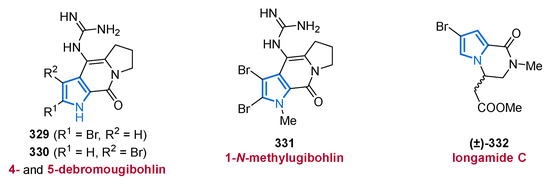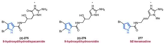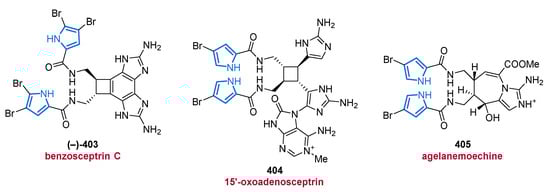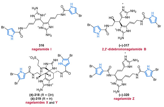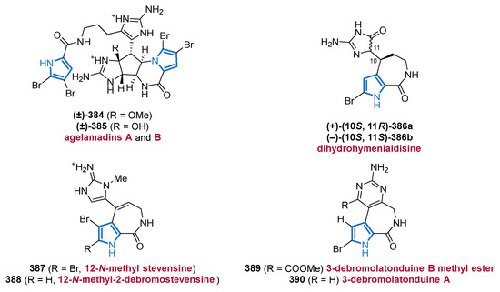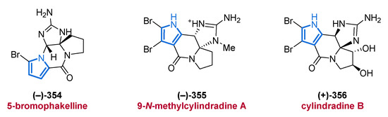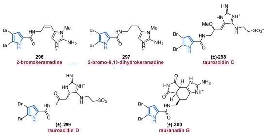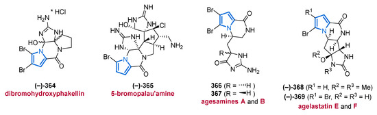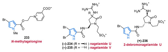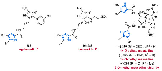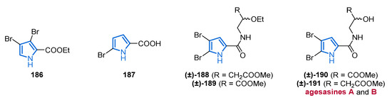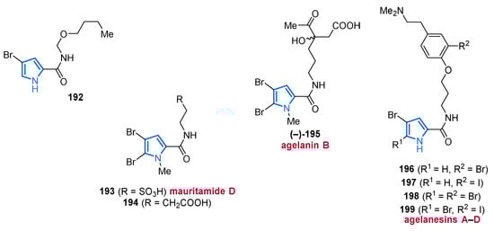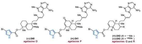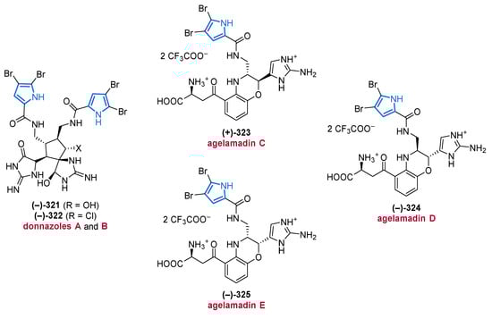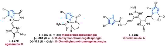 Another important source of bioactive MNPs is represented by the genus Agelas (family Agelasidae), which provides a wide diversity of glycolipids [58,59], diterpene alkaloids [60,61,62], and pyrrole alkaloids [63,64,65,66]. To date, more than 130 pyrrole alkaloids have been isolated from over 20 Agelas species, all of which share a unique bromo- or debromopyrrole-2-carboxamide moiety alongside several linear side chains, anellated ring systems, or dimeric structural units [67].