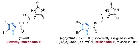 The macrocyclic tambjamine MYP1 (78) is produced by the marine bacterium Pseudoalteromonas citrea and was isolated in 2019 (Figure 10) [95]. The authors highlighted the important differences of the α- and β-rotamers in the tambjamine conformations, which are thought to play an essential role in their bioactivity. Moreover, the group provides an X-ray structure by co-crystallization of 78 with formic acid, unequivocally confirming the proposed structure of compound 78 [95].