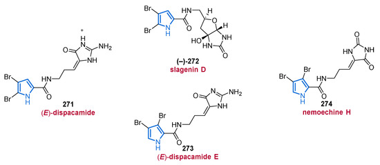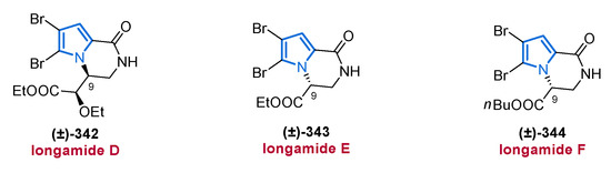 Some reduction products of the methyl esters and an amine derivative are represented by compounds 44–46, of which 45 occurs in both sponges, whereas 44 and 46 were exclusively isolated from the Nemoechinata sp. [68,69,76,77]. The carboxamide 47 is a debromo analog of mukanadin B and is present in Agelas nakamurai [68,78,79]. Compounds 42–47 described show neither cytotoxicity nor antimicrobial activity.