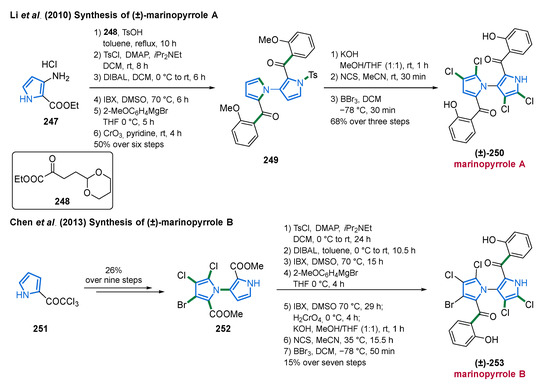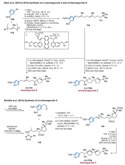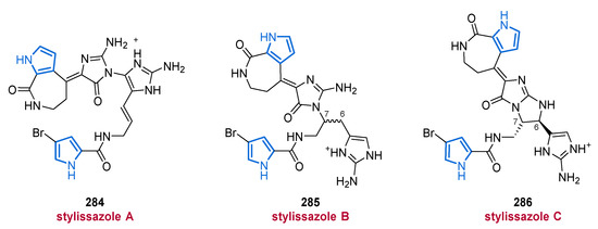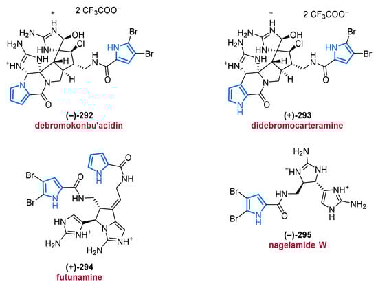 Among the marine alkaloids, which are largely composed of nitrogen-containing heterocycles, the pyrroles form a large group of intriguing natural products which occur in marine organisms ranging from microbes over algae and sponges to animals. Their structural diversity including terpenoid-, polyketide-, carbohydrate-, lipid-, and peptide-frameworks [7,12] accompanied by attractive biological properties, has spurred a considerable interest of chemists [6,13,14,15,16,17,18,19].