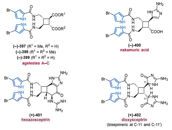 - Beniddir, M.A.; Evanno, L.; Joseph, D.; Skiredj, A.; Poupon, E. Emergence of Diversity and Stereochemical Outcomes in the Biosynthetic Pathways of Cyclobutane-centered Marine Alkaloid Dimers. Nat. Prod. Rep. 2016, 33, 820–842. [Google Scholar] [CrossRef]