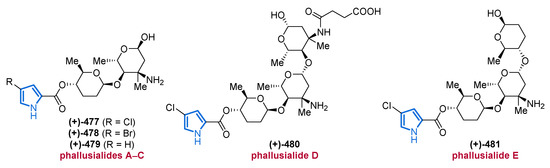 - Zhang, F.; Braun, D.R.; Chanana, S.; Rajski, S.R.; Bugni, T.S. Phallusialides A–E, Pyrrole-Derived Alkaloids Discovered from a Marine-Derived Micromonospora sp. Bacterium Using MS-Based Metabolomics Approaches. J. Nat. Prod. 2019, 82, 3432–3439. [Google Scholar] [CrossRef]
