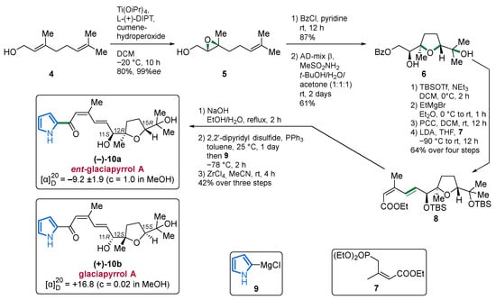 The pyrroloterpenoid glaciapyrrol A (10b) was already isolated along with its congeners glaciapyrrols B and C in 2005. Despite extensive investigations, the relative configuration of C-11 and the overall absolute configuration could not be determined at this time [43]. Through the first total synthesis of its four diastereomers by Dickschat in 2011, the relative configuration of the three stereocenters could be unequivocally established [44]. The authors devised an enantioselective synthesis starting from geraniol (4) using a Sharpless epoxidation to furnish alcohol 5. Protection of the alcohol functionality and subsequent Sharpless dihydroxylation followed by intramolecular cyclization served as the key step and stereoselectively generated compound 6. After several steps including a protection/deprotection sequence followed by oxidation and Horner–Wadsworth–Emmons (HWE) reaction using phosphonate 7, ester 8 was obtained in 64% over four steps. Saponification, the addition of pyrrolyl Grignard 9, and final TBS-deprotection finally produced ent-(−)-glaciapyrrol A (10a) showing the opposite optical rotation as the original publication from 2005. The authors, therefore, identified the natural product as (+)-glaciapyrrol A (10b) (Scheme 1) [44].