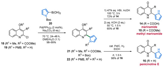 Based on the auspicious pharmacological activities of penicinoline E (16), marinamide (14), and methyl marinamide (15), the Nagarajan group established their total synthesis in 2017 for further biological testing [52]. They achieved a two- to three-step approach, characterized by a Suzuki–Miyaura coupling and subsequent dearomatization as key steps from their starting materials 18, 19, and 20. They were also able to unambiguously confirm the structure of penicinoline E (16) by X-ray crystallography (Scheme 2) [52].