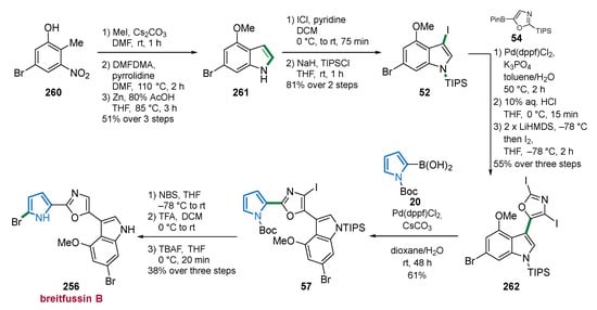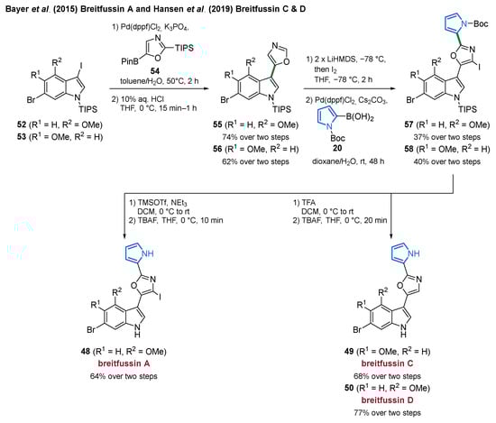 The first total synthesis and hence the structure validation of breitfussin A (48) was published by the Bayer group in 2015 [83]. They used an approach involving two Suzuki couplings in which the oxazole and pyrrole moieties were installed sequentially. First, indole 52 was converted with oxazole 54 into coupling product 55, followed by double lithiation of the oxazole core. Coupling with N-Boc-2-pyrrole boronic acid (20) furnished pyrrole 57, which, after removal of all protection groups, resulted in the formation of breitfussin A (48) [83]. Alongside the isolation of additional breitfussins in 2019, the Bayer laboratory employed the same approach as in their previous publication for the synthesis of breitfussin C (49) and D (50). Here, only the penultimate step varied by acid-mediated Boc-deprotection, since deiodination of the oxazole core was required (Scheme 4) [81].