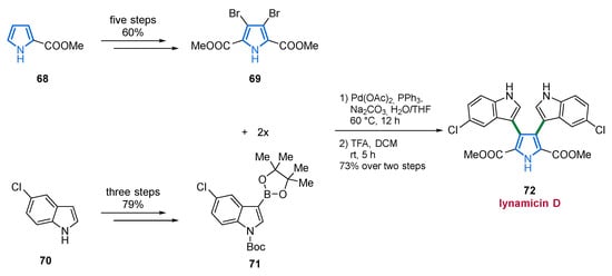 The total synthesis of lynamicin D (72) commenced with the synthesis of the coupling partners 69 and 71, prepared from commercially available precursors 68 and 70. Dibrominated pyrrole 69 was obtained by a Vilsmeier–Haack reaction, followed by oxidation, esterification, and final bromination. On the other side, 5-chloro-1H-indole (70) was first iodinated and Boc-protected and the introduction of the pinacol moiety on the basis of Pd-catalysis resulted in the formation of indole precursor 71. Building blocks 69 and 71 were then subjected to the key Suzuki coupling. Final removal of the Boc-group gave lynamicin D (72) in 73% yield over two steps (Scheme 5) [86].