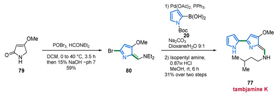 Based on the promising bioactivity of compound 77, Lindsley et al. were prompted to publish their first three-step total synthesis of tambjamine K (77) four months after its initial isolation [96]. The first step involved a Vilsmeier–Haack haloformylation which generated enamine 80 in 59% yield. A Suzuki coupling with Boc-1H-pyrrol-2-ylboronic acid (20) followed by acid-mediated condensation of isopentylamine resulted in the formation of tambjamine K (77) in 31% over two steps (Scheme 6) [96]. In addition to the natural product synthesis, a series of unnatural derivatives were synthesized followed by biological assays to evaluate basic structure–activity relationships (SAR). However, the natural product 77 showed moderate activity (IC50 values of 13.7 µM and 15.3 µM against HCT116 and MBA231, respectively), whereas the unnatural analogs were more potent in inhibiting the viability, proliferation, and invasion of HCT116, MBA231, SW 620, and H520 NSCLC cancer cell lines (IC50 values between 146 nM and 10 µM) [96].