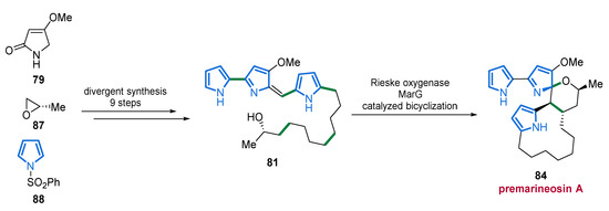 Not only the biosynthetic pathway but also the stereoselective synthesis of marineosins, their substructures, and derivatives have attracted much attention. In 2014, the Reynolds laboratory followed up on their previous publications regarding marineosins and reported the first total synthesis of HUPG (81) and premarineosin A (84). To this end, a divergent synthetic approach of nine steps in total stereospecifically provided 23-hydroxyundecylprodiginine (81). The final cyclization forming the spiro-tetrahydropyran-aminal unit of the premarineosin A (84) was then achieved by a biosynthetic approach via the Rieske oxygenase MarG (Scheme 7) [100]. This strategy yields several other prodiginine derivatives and premarineosin analogs that show promising cytotoxic and antimalarial activities [100].