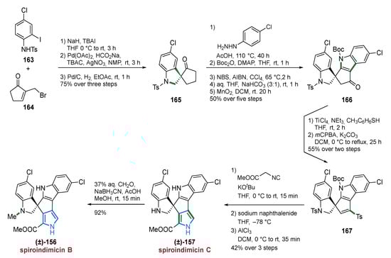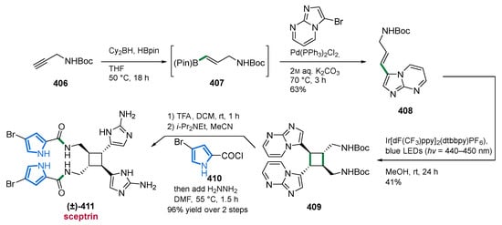 - Nguyen, L.V.; Jamison, T.F. Total Synthesis of (±)-Sceptrin. Org. Lett. 2020, 22, 6698–6702. [Google Scholar] [CrossRef]