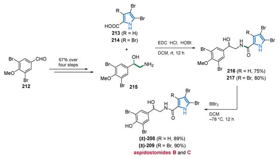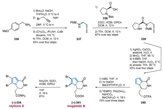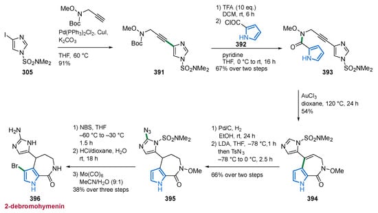 The authors applied a one-pot approach with a regioselective oxidative addition in which partially brominated N-acylpyrrole-1,2-dihydropyridines 36 and 37 were reacted with guanidine 38 in a double nucleophilic substitution to generate the aminoimidazoline moiety. Finally, the cyclic aminal structure is ring-opened by TFA, resulting in the MNPs 33 and 41 (Scheme 3) [71].