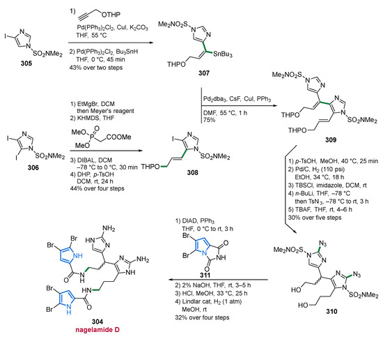 - Bhandari, M.R.; Sivappa, R.; Lovely, C.J. Total Synthesis of the Putative Structure of Nagelamide D. Org. Lett. 2009, 11, 1535–1538. [Google Scholar] [CrossRef]