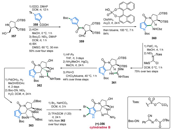 - Iwata, M.; Kamijoh, Y.; Yamamoto, E.; Yamanaka, M.; Nagasawa, K. Total Synthesis of Pyrrole–Imidazole Alkaloid (+)-Cylindradine B. Org. Lett. 2017, 19, 420–423. [Google Scholar] [CrossRef] [PubMed]